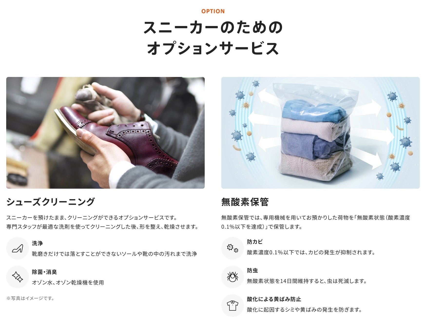 さらに、大切なスニーカーを含む、ご自宅での保管が難しいとされる和服やドレス、革製品といったアイテムに対しては、「無酸素保管オプションサービス」を提供しています。このオプションサービスでは、通常の空調管理に加えて、専用機械を用いて酸素濃度を0.1%以下の無酸素状態に保つことで、酸化による劣化やダメージを防ぎます。スニーカーをはじめとする大切なアイテムを、経年変化の影響を最小限に抑え、預け入れ時のコンディションを長期間維持することが可能です。