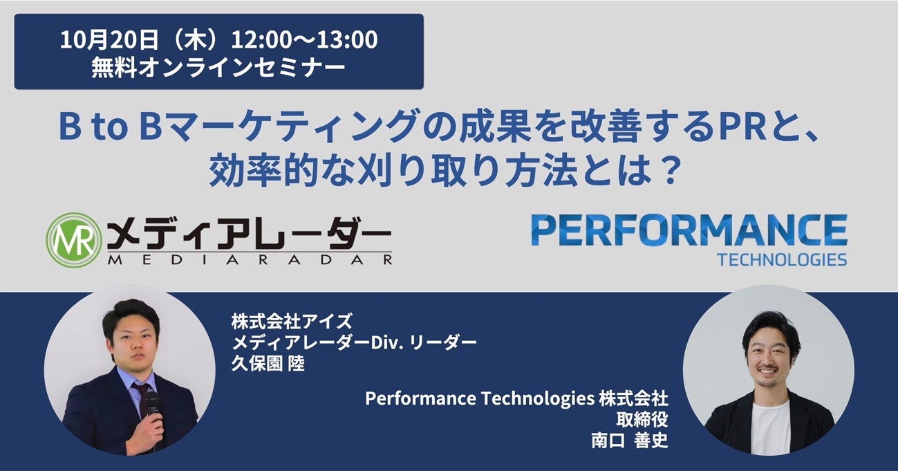 株式会社アイズ(所在地:東京都渋谷区、代表取締役社長:福島範幸)が運営する媒体資料のポータルサイト「メディアレーダー」(https://media-radar.jp/)は、Performance Technologies株式会社(本社:東京都港区、代表取締役:木村 和央、以下Performance Technologies)との共催セミナー「B to Bマーケティングの成果を改善するPRと、効率的な刈り取り方法とは?」を、2022年10月20日(木)12時より開催いたします。