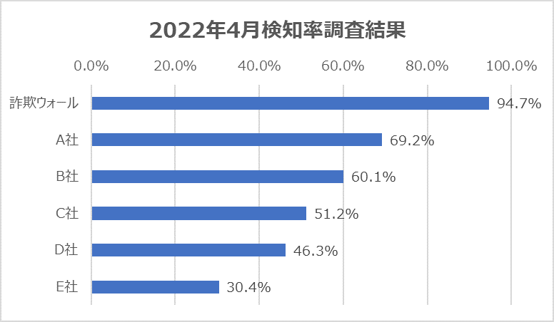 詐欺ウォールを開発・提供するBBソフトサービスでは、公的機関などとの連携によって収集した詐欺サイトURLを利用し、定期的に詐欺サイトの検知率調査を行っています。2022年4月の詐欺ウォールによる詐欺サイト検知率は94.7%と他社と比較し高い結果となりました。