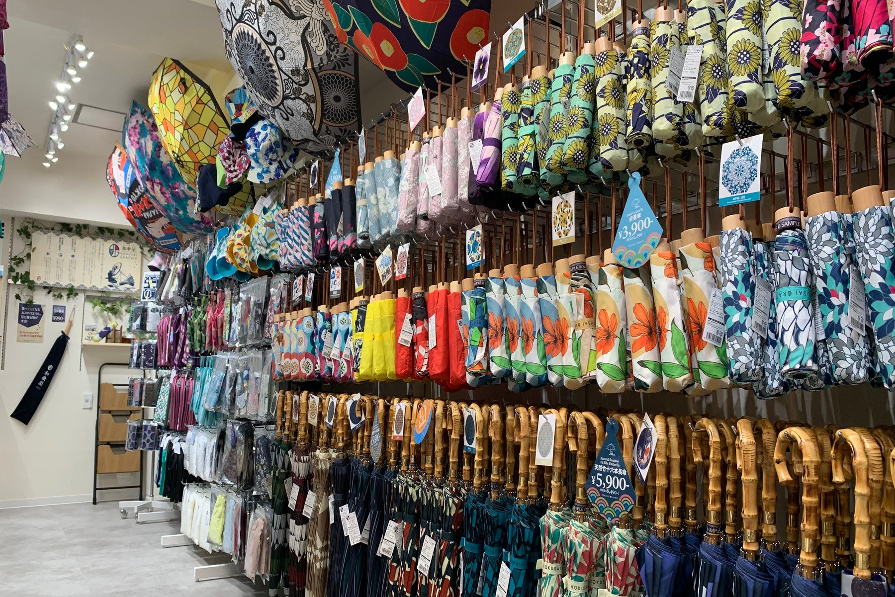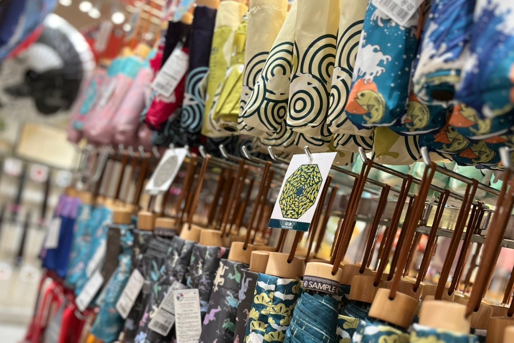 店内には、全てオリジナルデザインのさまざまな和柄傘がずらりと並びます。傘一本一本にストーリー性があり、季節やファッションに合わせて選べるのが魅力です。