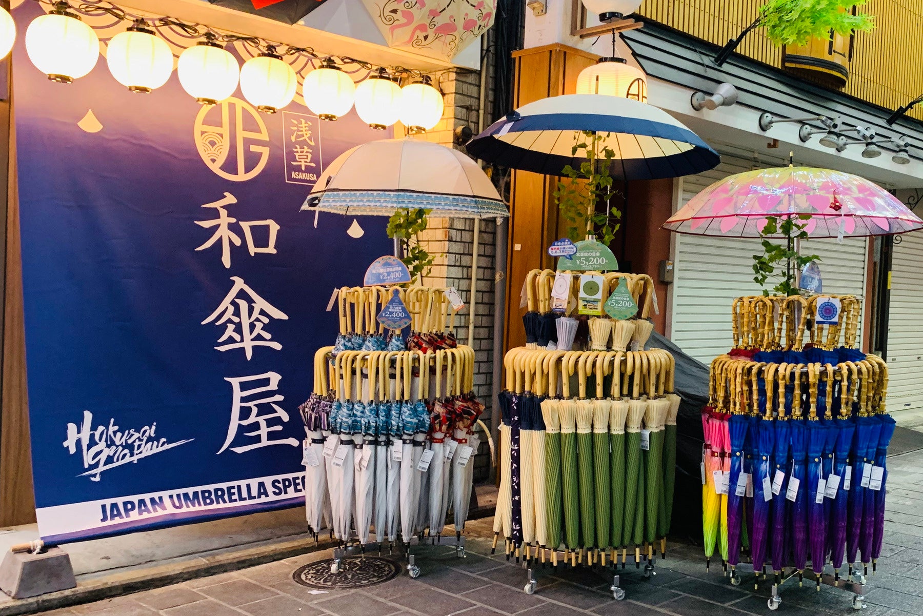 青を基調とした幕と提灯が目を引く外観は、浅草の町並みに調和しつつ、写真映えするフォトスポットです。店舗前には実際の傘をディスプレイし、和柄の美しさを直接ご覧いただけます。