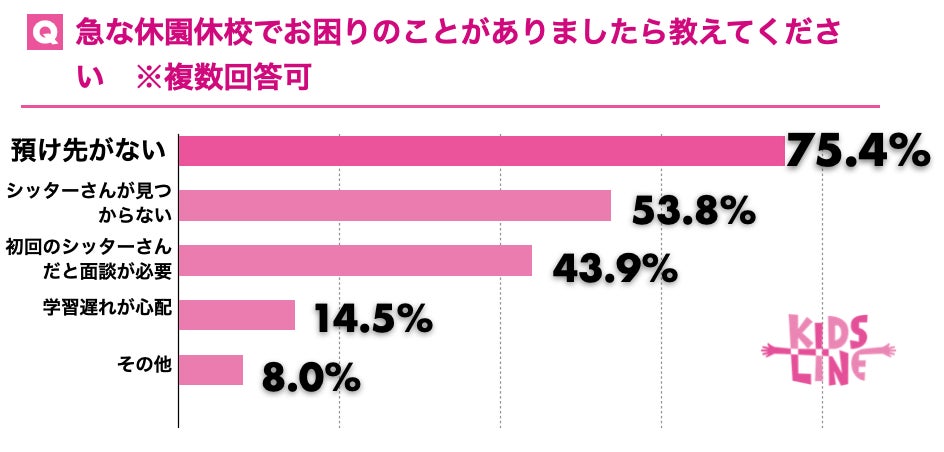 急な休園休校になったご家庭に「お困りのことがありましたら教えてください」と質問したところ「預け先がない」が75.4%、「シッターが見つからない」と回答した人が53.4%(複数回答)でした。