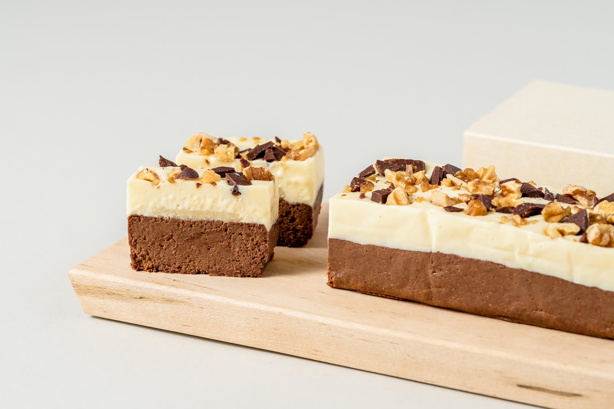 心地よい甘さの生ガトーショコラとミルキーなバナナカスタードクリーム、そしてクリーミーでほんのり酸味を感じる2種のチーズを使った"フロスティング”が織りなす至福の味わいをご堪能ください。仕上げにチョコレートチップと、塩とスパイスパウダーをまぶしてローストしたくるみを載せることで、食感と香りにアクセントを加えています。