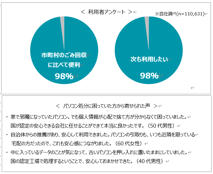 利用者アンケートでも98%の方が「市町村のごみ回収に比べて便利」、98%が「次も利用したい」と回答し、満足度の高いサービスとして評価をいただいています。