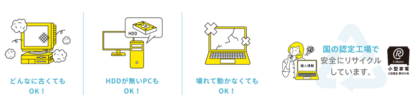 宅配便リサイクルは、事前に申込み後、希望日時(年中無休・最短翌日)に佐川急便がご自宅から回収し、国の認定工場で確実に処理を行います。回収から処理完了まではトレーサビリティーを管理しマイページ/メールで提供しています。また、パソコンについては多くのデータが含まれることから、データ消去ソフトを無償提供、希望者にはデータ消去サービスを提供しています。