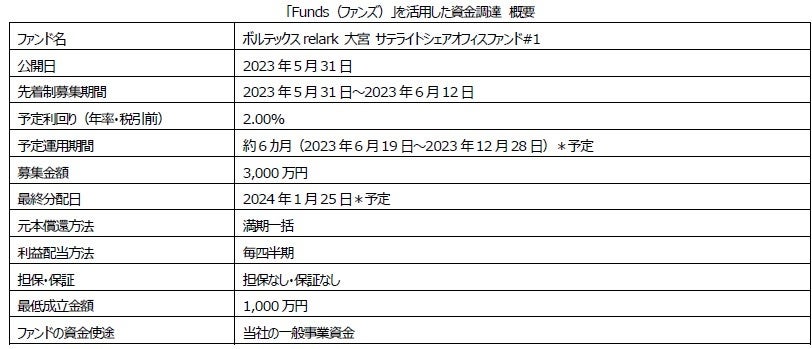 「区分所有オフィス®」を主軸に資産形成コンサルティングを行う株式会社ボルテックス(東京都千代田区 代表取締役社長 兼 CEO 宮沢 文彦、以下当社)は、ファンズ株式会社(本社:東京都渋谷区 代表取締役 藤田雄一郎、以下ファンズ)が運営する手数料無料で1円から貸付投資ができる貸付ファンドのオンラインマーケット「Funds(ファンズ)」を通じて、当社の一般事業資金を調達しました。今回は3,000万円を受け付けましたが、募集開始より早期に満額(100%)成立となりました。