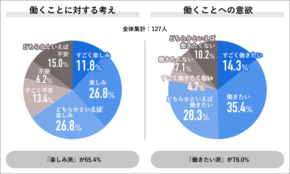 働くことへの考えでは「すごく楽しみ」11.8%、「楽しみ」26.8%、「どちらかと言えば楽しみ」26.8%を合算した65.4%が”楽しみ派”の回答をしました。また働くことへの意欲では「すごく働きたい」14.3%、「働きたい」35.4%、「どちらかといえば働きたい」28.3%を合算した78.0%が”働きたい派”の回答をしました。一方で全体の22.0%になる127人中28人が”働きたくない派”を回答する結果になりました。