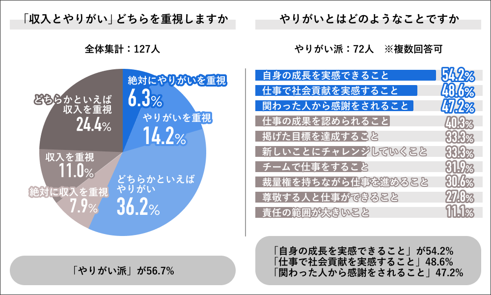 仕事において収入とやりがいどちらを重視するかについては、「絶対にやりがいを重視」6.3%、「やりがいを重視」14.2%、「どちらかといえばやりがいを重視」36.2%を合算した、56.7%が”やりがい重視派”を回答しました。また”やりがい派”を回答した72人に対してどのようなことにやりがいを感じるかを聞くと、「自分の成長を実感できること」が54.2%で最多回答になり、次いで「仕事で社会貢献を実感できること」が48.6%、「関わった人から感謝をされること」が47.2%で、上位3つの回答結果になりました。