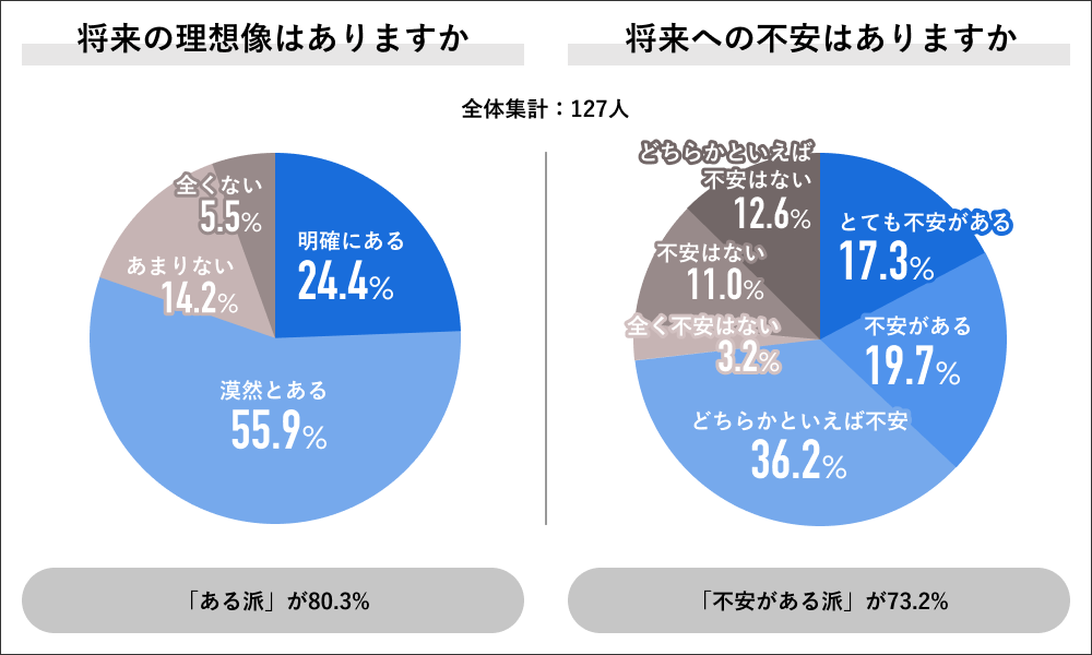 将来に対する自身の理想像について聞くと、「明確にある」が24.4%で、「漠然とある」が55.9%になり、合算した80.3%は理想像が”ある派”の回答をしました。一方将来への不安の有無について聞くと、「とても不安がある」17.3%、「不安がある」19.7%、「どちらかといえば不安がある」36.2%を合算した、73.2%が”不安がある派”の回答をしました。