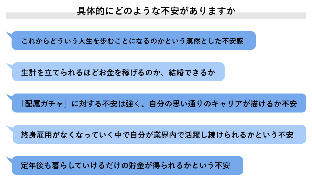 将来に不安があると回答した93人に不安の内容を聞くと自身のキャリアや収入に対するものが顕著でした。
