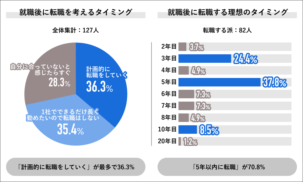 就職後に転職を考えるタイミングについて聞くと、「計画的に転職をしていく」が36.3%で最多回答になり、次いで「1社でできるだけ長く働きたいので転職はしない」が35.4%、「自分に合っていないと感じたらすぐに転職をする」が28.3%の回答結果になりました。”転職をする派”を回答した82人に就職後に転職をする理想のタイミングを聞くと「5年目」が37.8%で最多回答になり、次いで「3年目」が24.4%で、全体的には5年以内の転職が70.8%という回答結果になりました。