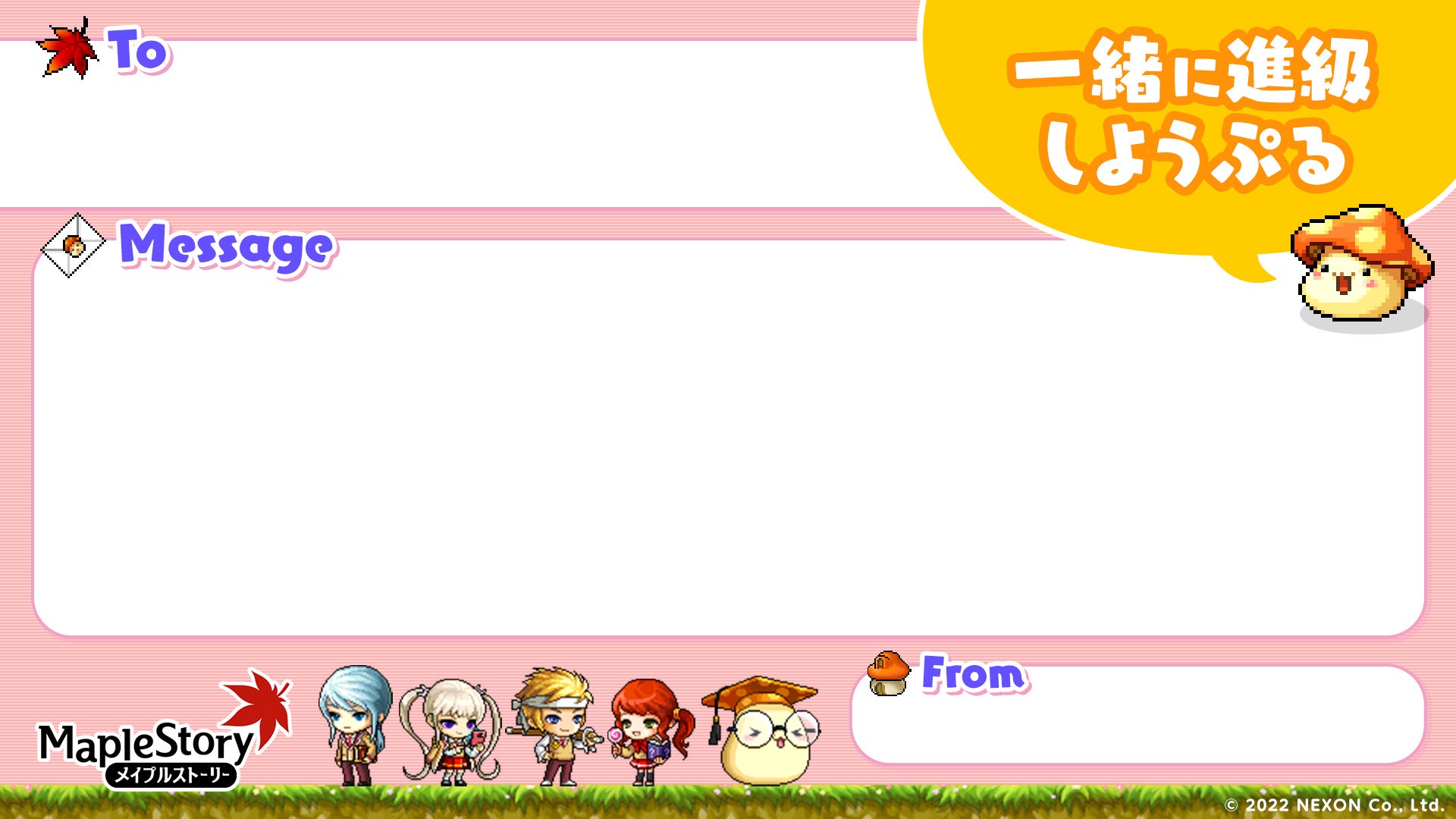 「一緒に進級しようぷる」企画は、 『メイプルストーリー』内で再会したいと思っている、懐かしいお友達やプレイ仲間へのメッセージを募集する企画です。メッセージを投稿いただいた方や、メッセージを送ったプレイヤーと再会できた方に、ゲーム内アイテムをプレゼントいたします。