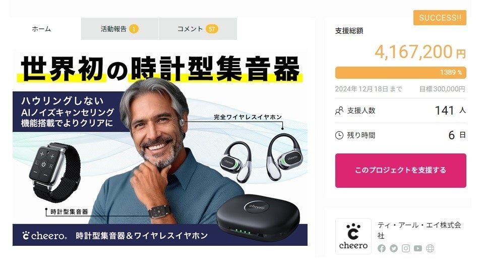 【cheero】時計型ワイヤレス集音器「Kikiyasu(キキヤス)」の支援金額が1300%を達成しました。予約販売は残り6日で終了します。