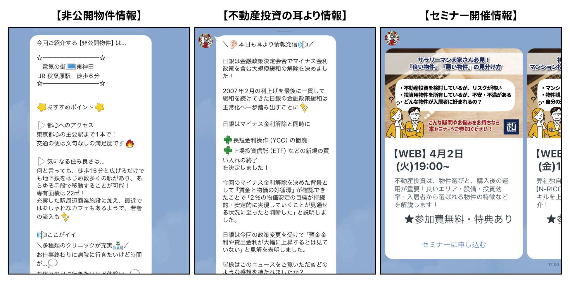 現在は、不動産投資の耳より情報、非公開物件情報、セミナー開催情報などを配信しておりますが、今以上に有益な情報を届け続けられるよう、今後もコンテンツアップデートに尽力して参ります。