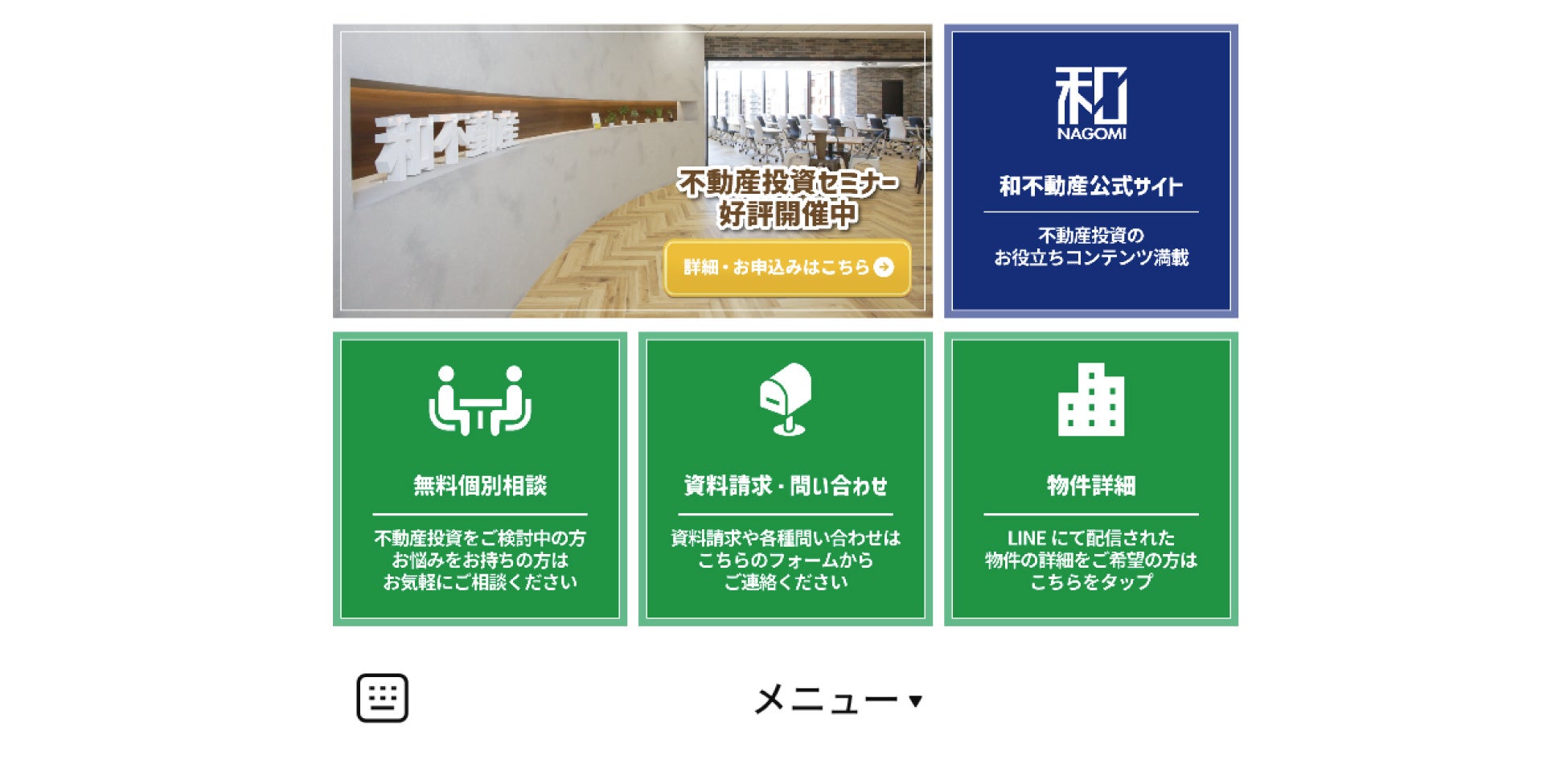 【和不動産公式LINE】は、メッセージ配信だけでなくメニューやプロフィールも充実しています。