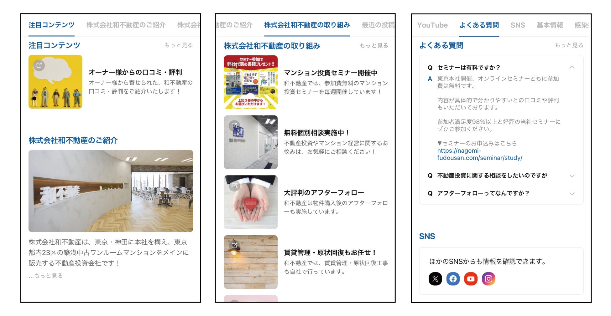 プロフィールページでは、和不動産の評判や事業内容を紹介したページ、お客様からよく寄せられる質問と回答などをまとめています。