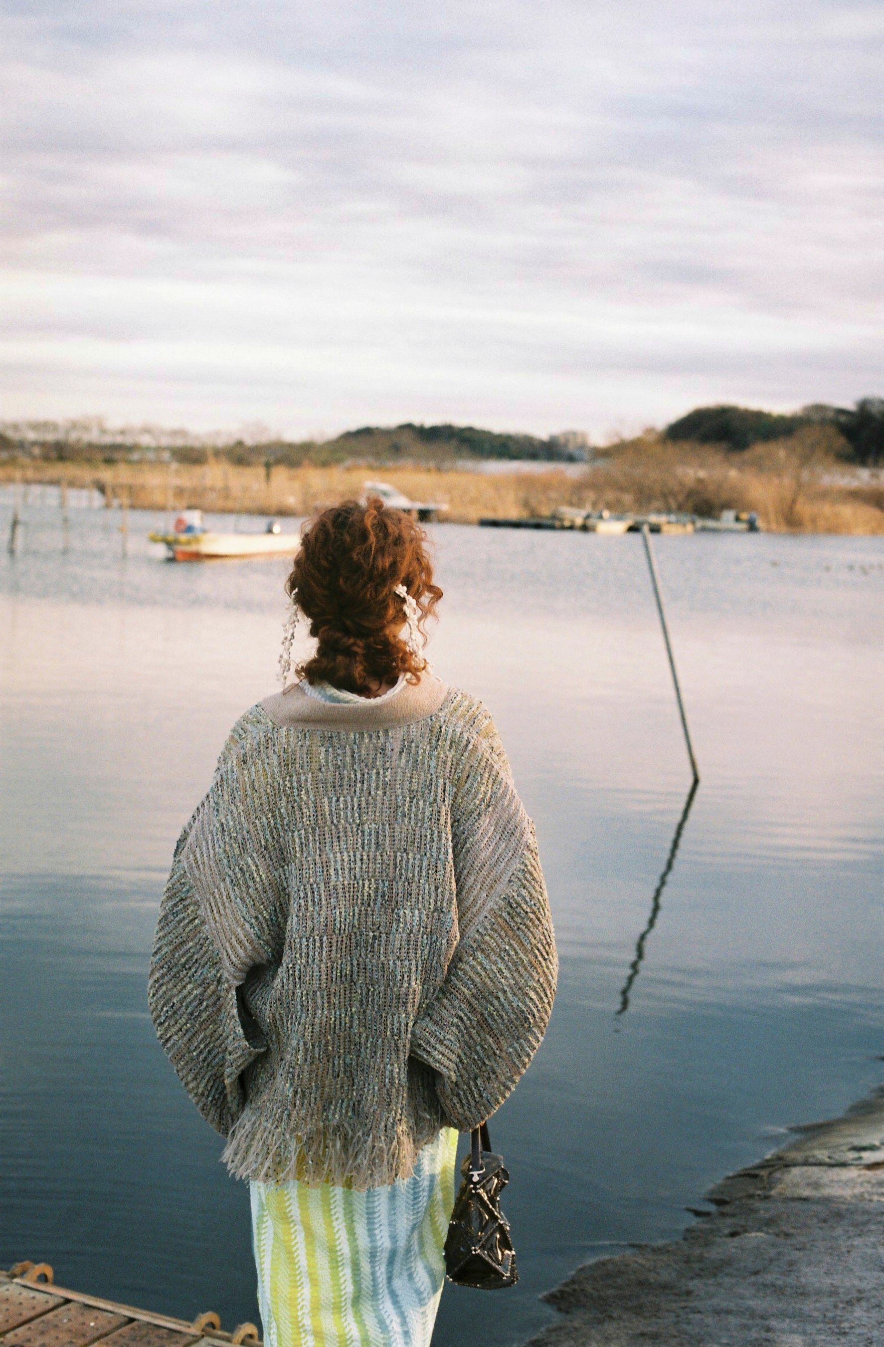 さまざまな形状の糸を用いて生地をつくることができる編み物の特徴を活かし、製作した羽織です。シャリ感のある糸と羽毛感のある糸を混ぜ込んでいるため、季節を問わずお召しいただけます。ポイントは、歩くたびにヒラヒラと動く裾部分の長いフリンジ。レース羽織とは異なる、ふんわりとした風合いとシルエットも魅力です。