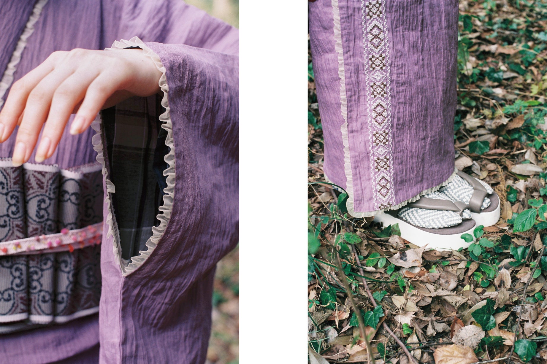 KIMONO by NADESHIKOで人気カラーの小千谷縮に“ひとさじのスパイス”を加えました。自分好みのアレンジを加えて楽しんでいただけるよう、無地の小千谷縮に刺繍を施しています。刺繍はチロリアンテープをイメージし、立体感が出るように。刺繍の場所は、衿か衽を選べるようにしています。