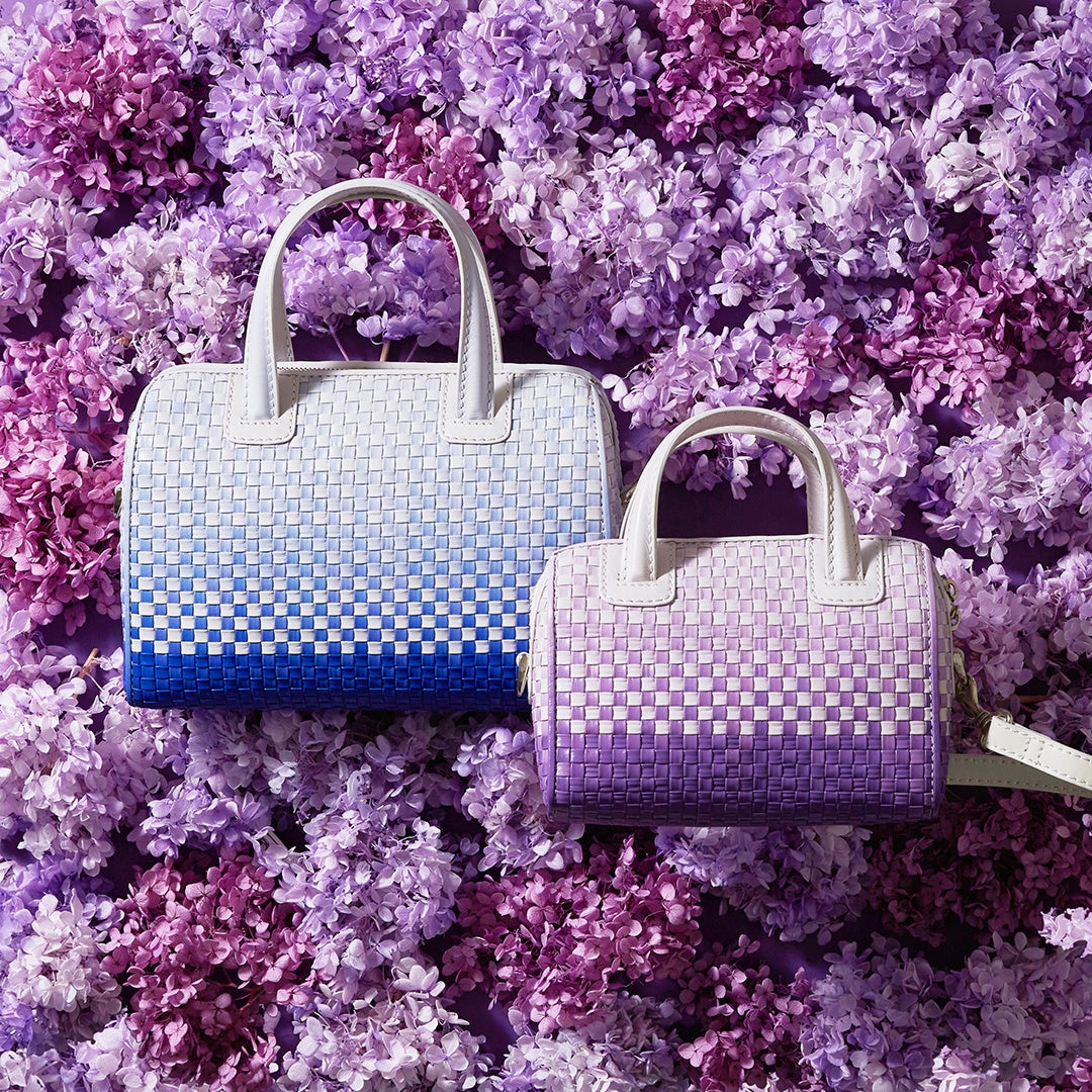 コロンとしたフォルムが軽やかなSサイズと、長財布やペットボトルが入るMサイズの2種類をご用意しています。カラーは「アオ」と「ムラサキ」の2色ですが、ランダムに編み込まれるグラデーションレザーは、ひとつとして同じものがありません。職人の手仕事によって生まれる、一期一会の出会いをお楽しみいただけます。