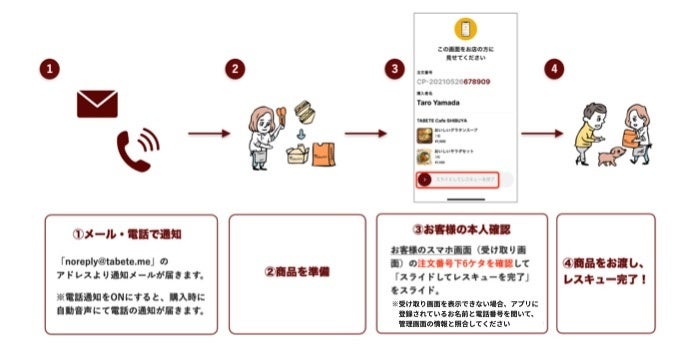 購入が確定するとお店に通知が届きます。購入者が来店したら、アプリの画面を確認して商品を渡せば「レスキュー」完了です。なお、ユーザーはアプリ上でクレジットカード決済を済ませてから引き取りに行く仕組みのため、店頭での金銭のやり取りは発生しません。