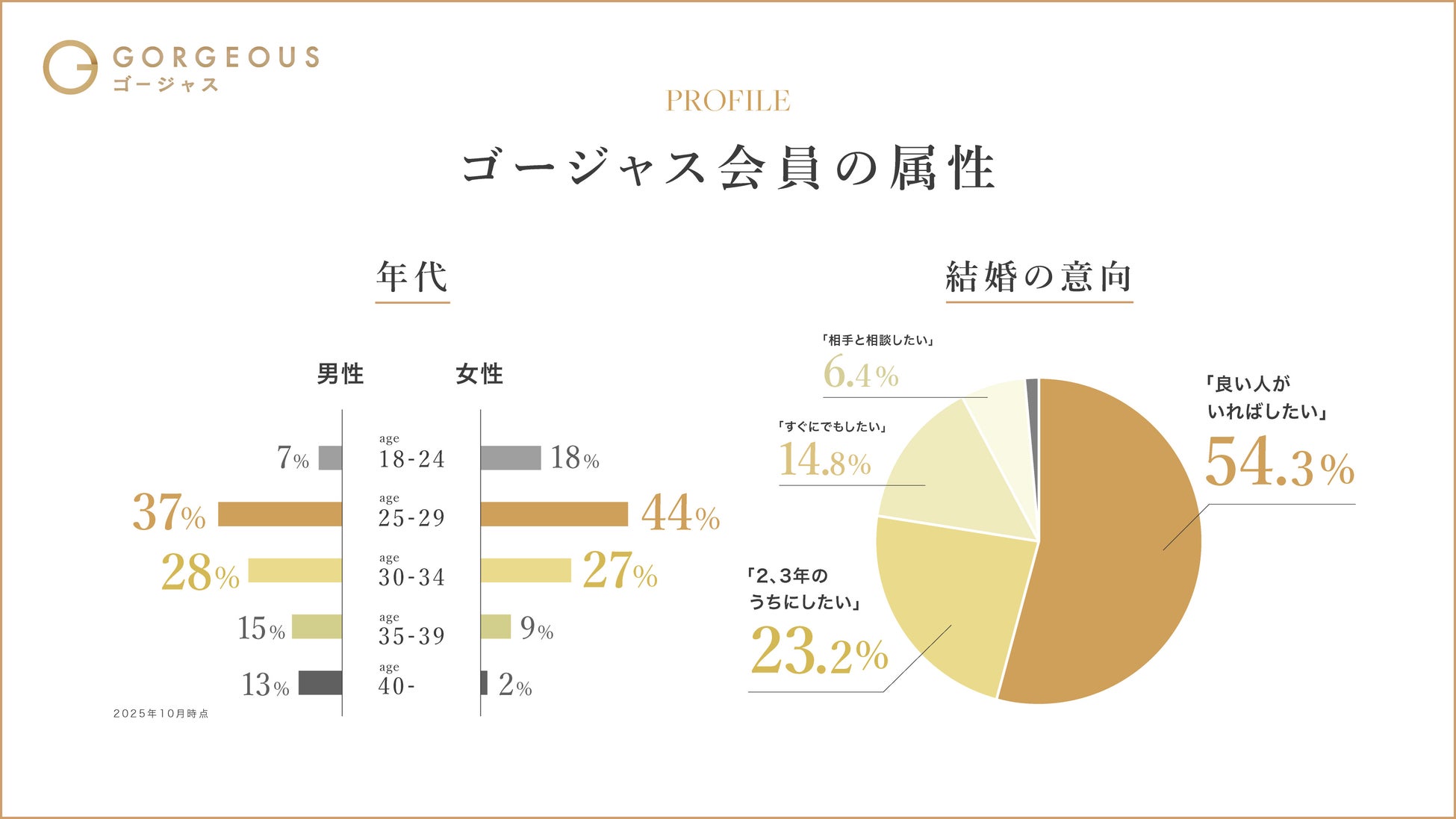リンク株式会社(アイザックグループ/本社: 東京都渋谷区/代表取締役CEO: 白井 僚)が運営する、完全審査制の恋活・婚活マッチングアプリ「ゴージャス」は、2025年10月23日でサービス開始3周年を迎えます。これを記念して、ゴージャス内の傾向を振り返るインフォグラフィックスを公開しました。