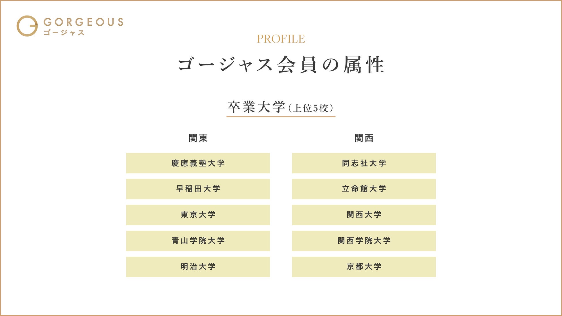 出身大学を見ると、関東エリアでは慶應義塾大学、早稲田大学、東京大学、関西エリアでは同志社大学、立命館大学、関西大学が上位を占め、いずれの地域も主要大学出身者が多く、ハイクラスな会員が集っているようです。