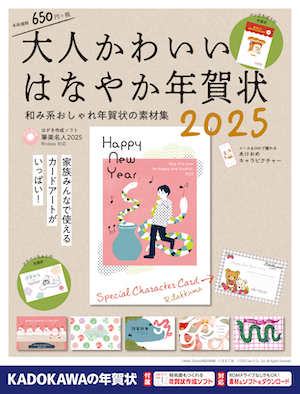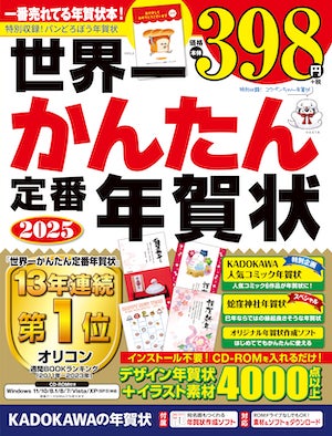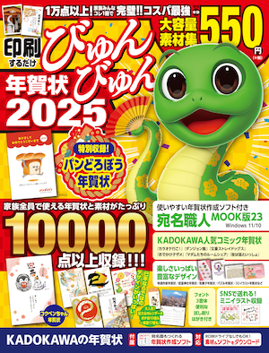 2025年版は特別収録として大人気の絵本「パンどろぼう」の年賀状を収録。また毎年好評の「コウペンちゃん」年賀状や、人気コミックの1シーンを使った年賀状など、KADOKAWAならではのオリジナルデザインを各種収録しました。年賀状素材やソフトは公式サイトからダウンロードもできるので、PCにROMドライブがなくてもお使いいただけます。