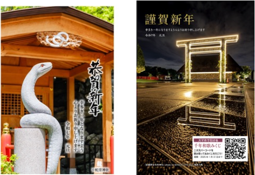 巳年にちなみ「白蛇日本三大聖地」のひとつとして知られる蛇窪神社の年賀状デザインを収録※1。また、KADOKAWAコラボ年賀状として、令和神社年賀状では湘南乃風 SHOCK EYE氏撮影の写真を使用したデザインや、人気ライトノベル「狼と香辛料」コラボイラストを使用したデザインをご用意しました※2。