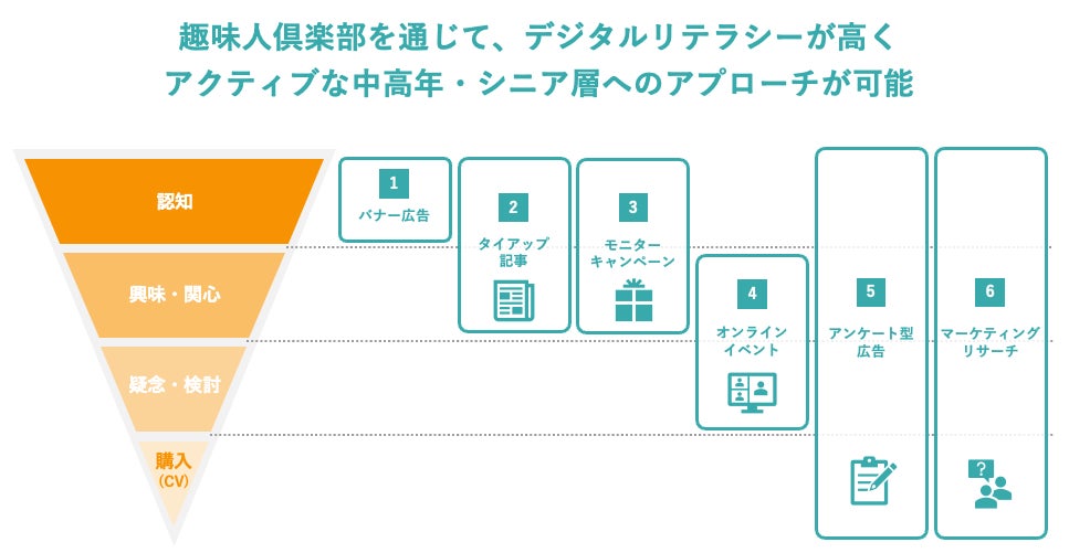 日本最大級のシニアコミュニティである趣味人倶楽部において、40万人(メール会員含む)のアクティブシニアへアプローチできるリーチ力を生かし、広告出稿を支援しております。