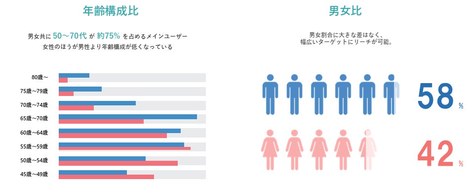 月間3,000万PVを誇る国内最大級の中高年・シニア向けSNS。50~70代のおとな世代をメインユーザ