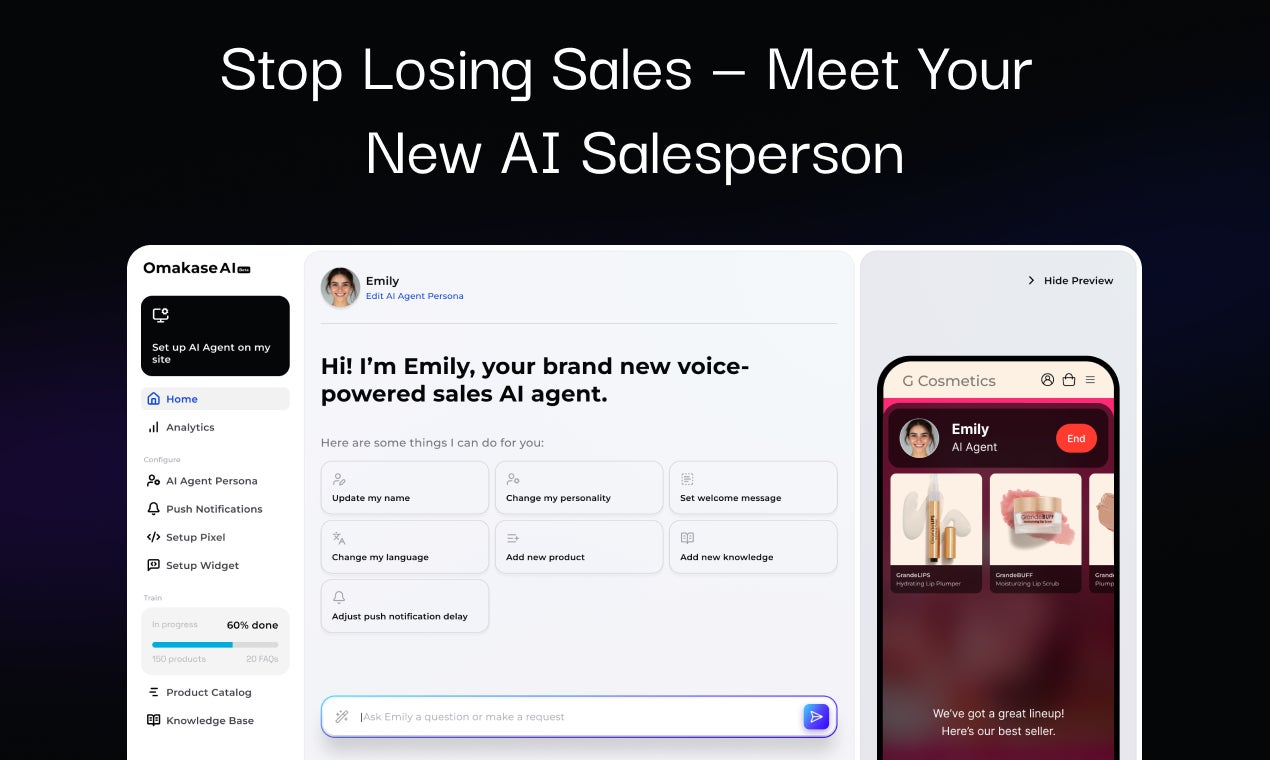 「Omakase.ai Voice」は、企業のWebサイトにURLを入力するだけで、まるでリアル店舗の優秀な販売員のように“声で顧客と会話し、販売する”AIを即時に導入できるまったく新しいソリューションです。複雑な設定や開発は一切不要、コードも不要で、今すぐに接客AIエージェントが、貴社のWeb接客を革新します。