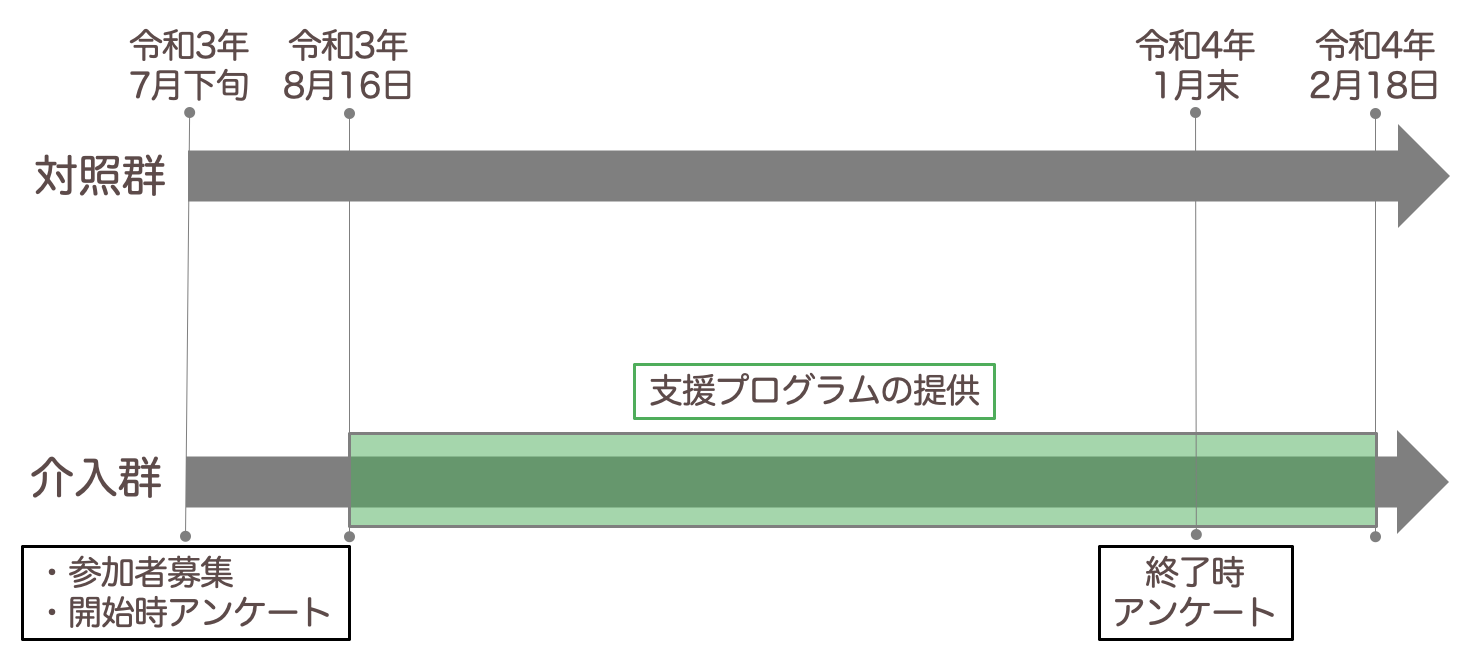 事業開始時と終了時に両群へオンライン調査票を送付し、両群から得られた回答を事業開始前後で比較することで、支援プログラムの有効性を客観的に検証しました。