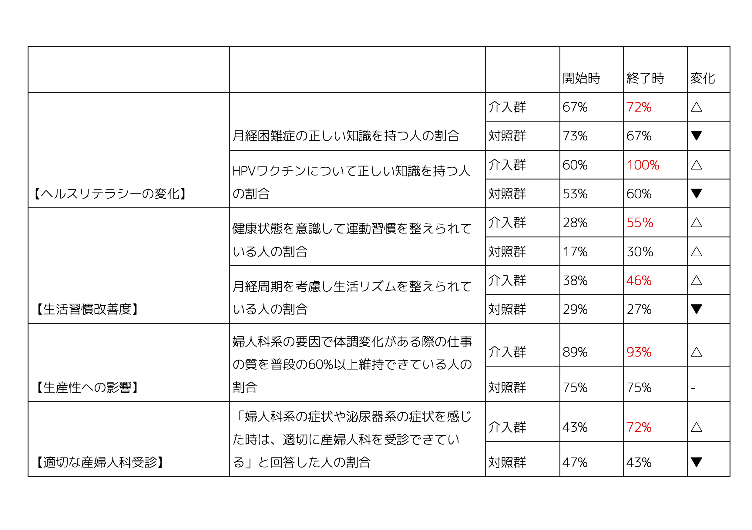 月経困難症の正しい知識を持つ人の割合が、介入群では開始時67%から終了時72%へ増加しました(一方、対照群では73%→67%へ低下していました)。