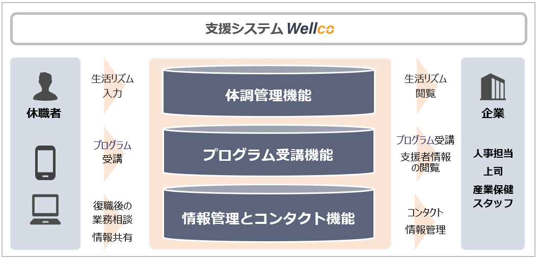 そしてこの度、休職中の従業員を対象にした法人向けサービス『オンラインリワーク支援』の提供を開始いたします。専用の支援システム『Wellco』を使用した本サービスにより、①休職者の業務遂行能力等の回復 ②再発防止策の習得 ③復職までの情報共有と復職判断 ④復職後の支援体制や環境整備 の支援をおこない、“再休職率0%”を目指してまいります。