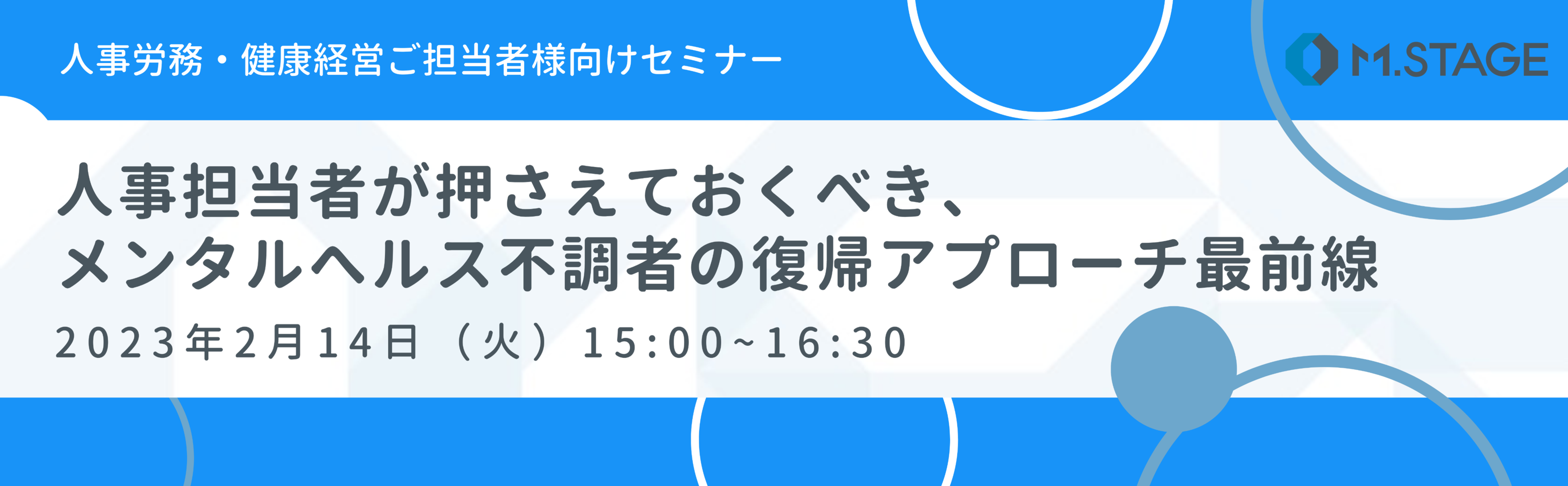 事業場向け産業保健支援、医療人材総合サービスを提供する株式会社エムステージ(東京都品川区、代表取締役:杉田雄二)は、グループ会社である株式会社リウェル(東京都品川区、代表取締役:鈴木友紀夫)が運営する法人向けリワーク(復職)支援サービス『オンラインリワーク支援』の2023年4月1日(土)提供開始に伴い、2023年2月14日(火)15:00より、人事労務・健康経営ご担当者様向けの無料オンラインセミナーを開催いたします。