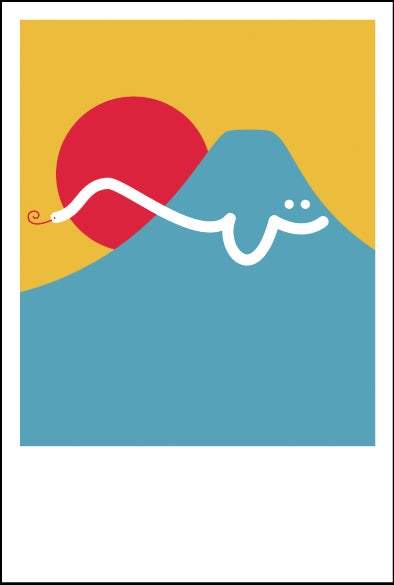 「神様の化身」や「神様の使い」と言われ、幸運を呼ぶ存在として知られている白蛇が富士山の周りをゆっくりと、平仮名の「へび」の文字形に泳いでいます。どことなく富士山も笑顔に見え、予測不能な楽しいことが起こりそうな予感のするデザインにしました。