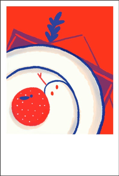 上から見てみると…もしかしたら鏡餅がヘビになってたりして。そんな想像をしながら描いてみました!赤と青の組み合わせで、お正月らしくめでたくポップに仕上げました。