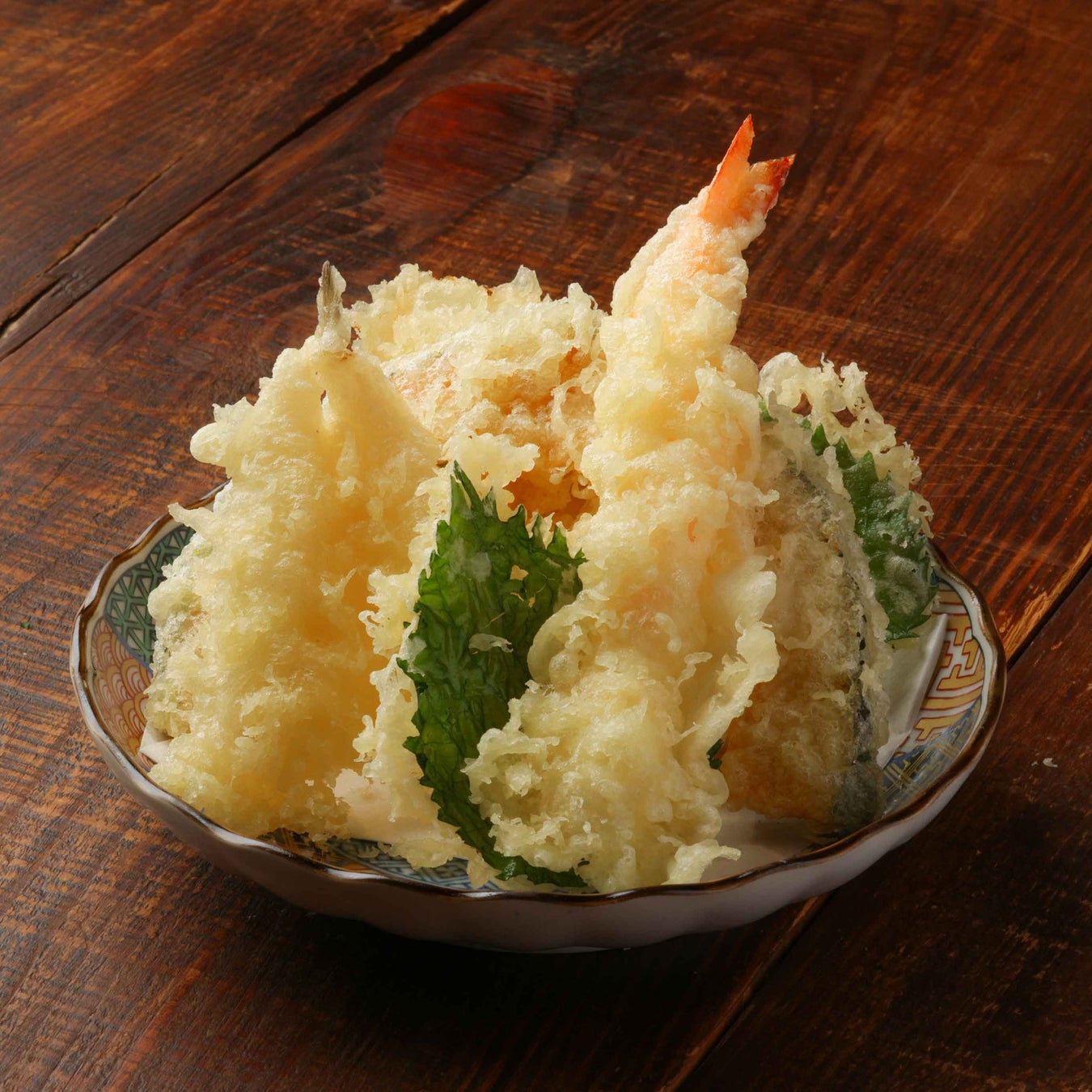 2つ目の柱の"天ぷら"も寿司同様に1品90円(税抜)~とリーズナブルな価格でご用意。イカや穴子1本といった定番メニューだけではなく「貝出汁!沁み大根天」、「海苔とイクラととびっこ」といった意外性と驚きのある創作天ぷらや四季折々の旬素材の天ぷらをお愉しみいただけます。