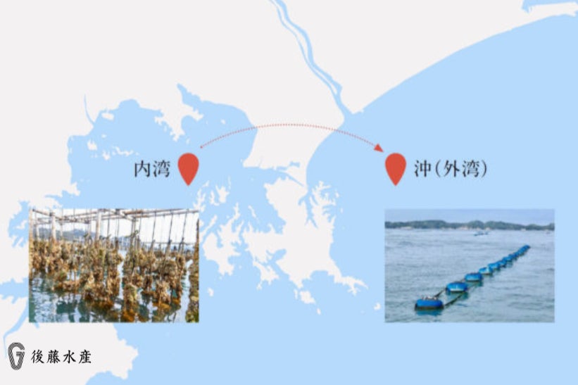 品質へのこだわりのひとつが、抑制した牡蠣を縄に挟み込み、約4ヶ月から10ヶ月内湾で育成させた牡蠣を、8月頭から約2ヶ月間かけて沖に移動させる「沖出し」。これは全国でも鳴瀬でしか行われていない、独自の工程です。このため、奥羽山脈から流れてくる山の栄養をたくさん摂取することができ、内湾より波が荒いため、身が引き締まったプリプリの牡蠣になるとされています。