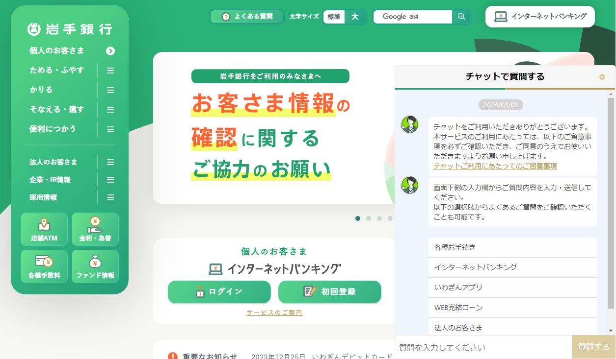 2024年3月より、PKSHA FAQとPKSHA Chatbotを同時導入し、お客さま向けに展開されます。PKSHA FAQは岩手銀行ホームページのほか、岩手銀行が展開するアプリ「いわぎんアプリ」から参照でき、PKSHA Chatbotについては、その2ヶ所に加えて岩手銀行のLINE公式アカウントにも設置される等、多数の接点への同時展開が実現されました。