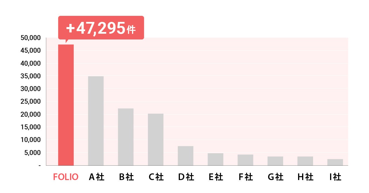 下表は2023年度通期の「ラップ業務」にかかる投資一任契約における主要10社※2の契約増加件数です。FOLIOが+47,295件で第1位※1となりました。AI投資「ROBOPRO」や「おまかせ投資」に加えて、投資一任プラットフォーム「4RAP(フォーラップ)」を活用した複数の投資一任サービスが、お客さまからご評価をいただいた結果と考えております。今後もより多くの皆さまの資産形成に貢献できるよう努めてまいります。