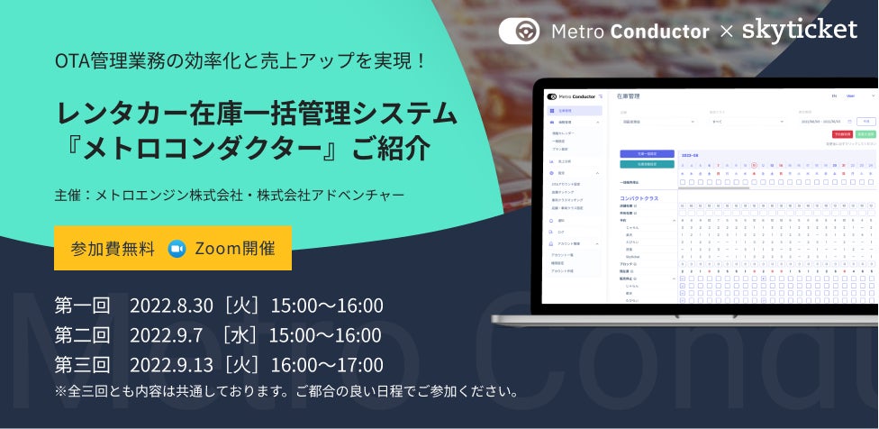 宿泊施設向けレベニューマネジメントツール『メトロエンジン』を提供し、DX化や集客支援を行うメトロエンジン株式会社(本社:東京都港区、代表取締役CEO:田中良介、以下メトロエンジン)と、航空券、レンタカー、ホテルなどを予約できる総合旅行予約サイト『skyticket』を運営する株式会社アドベンチャー(本社:東京都渋谷区、代表取締役社長:中村俊一、以下アドベンチャー)は8月30日(火)、9月7日(水)、9月13日(火)に「OTA管理業務の効率化と売上アップを実現!レンタカー在庫一括管理システム『メトロコンダクター』ご紹介」を合同開催いたします。