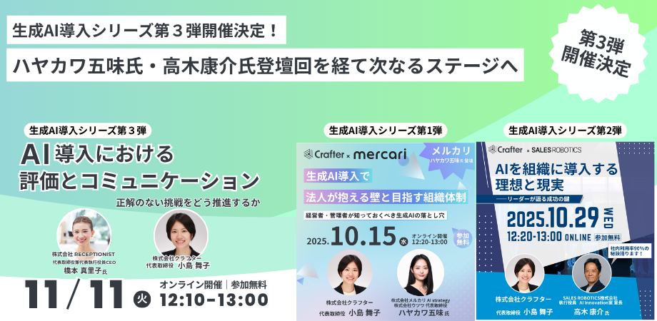 株式会社クラフター(本社:東京都港区、代表取締役:小島舞子)は、企業の生成AI導入をテーマにしたオンラインイベントシリーズを開催しています。
