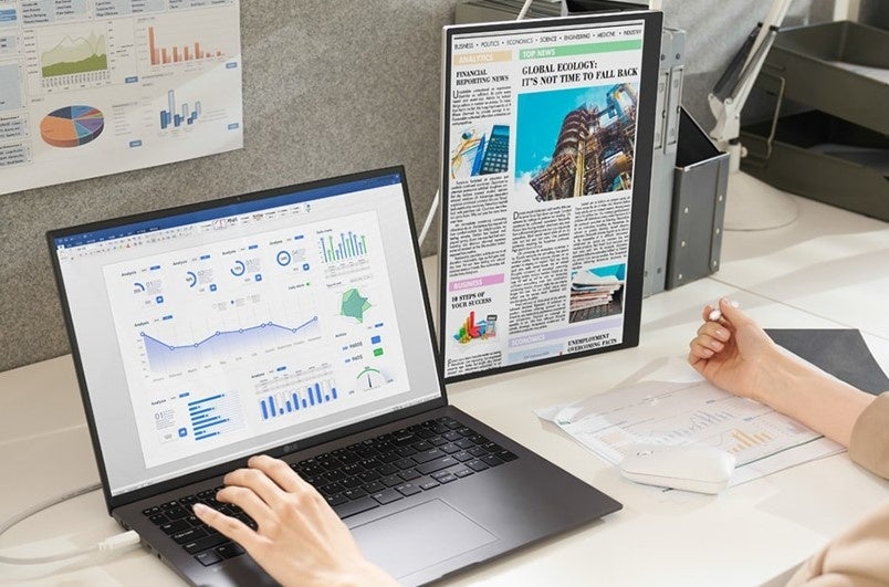 ノートパソコンと接続すれば、2画面のデュアルモニターとして拡張することができ、快適な作業空間を作り出すことで、マルチ作業の生産性が大幅にアップします。また、電源供給はUSB Type-C経由で、LG gramからも給電が可能で、持ち運べる広大な画面によって、「片手で持ち歩ける、どこでも本格ワークスペース」を実現します。