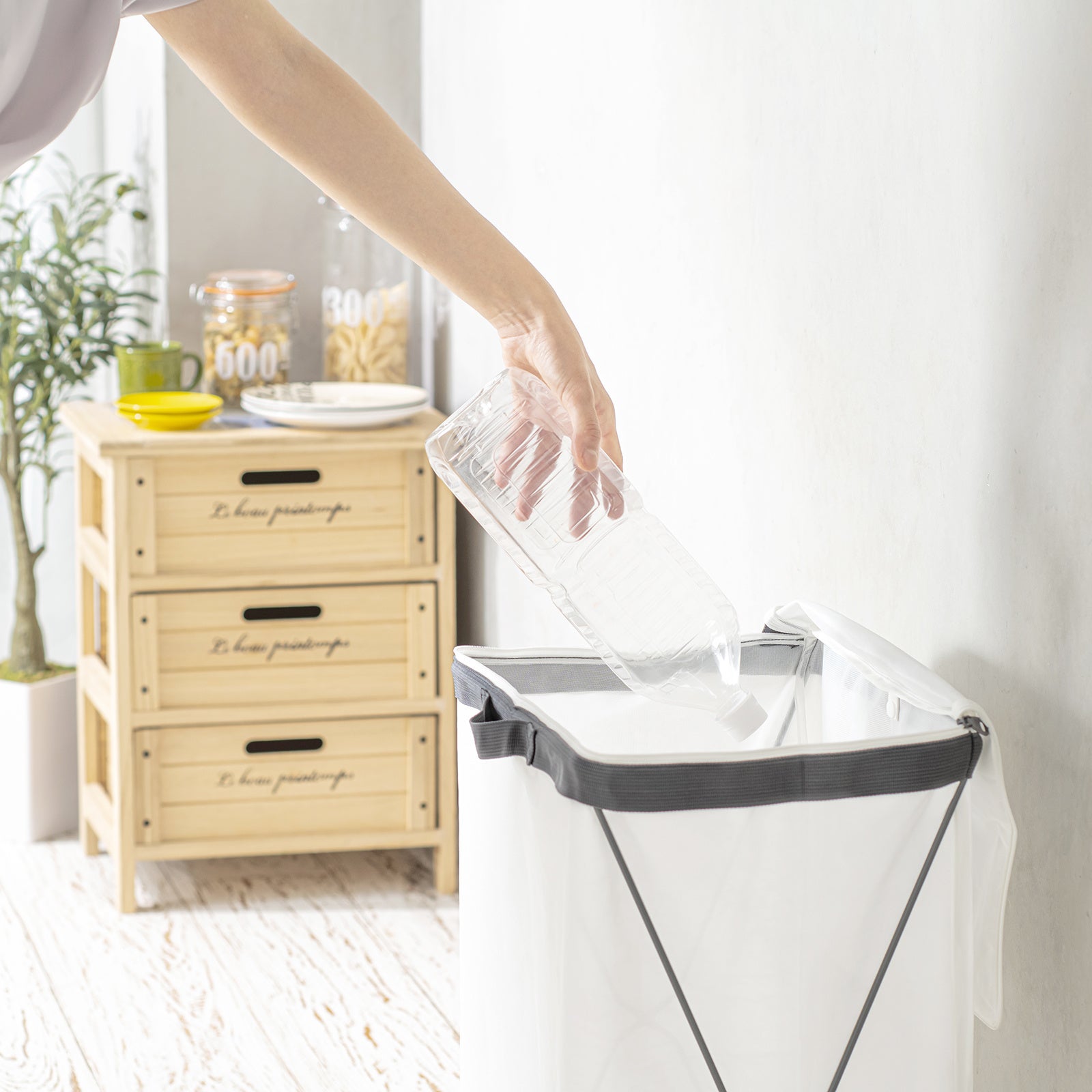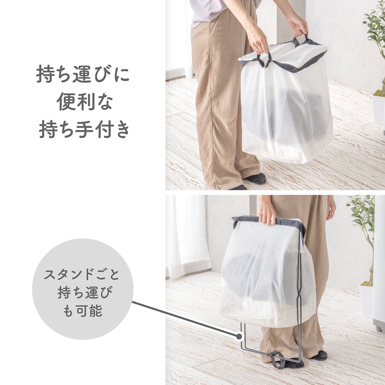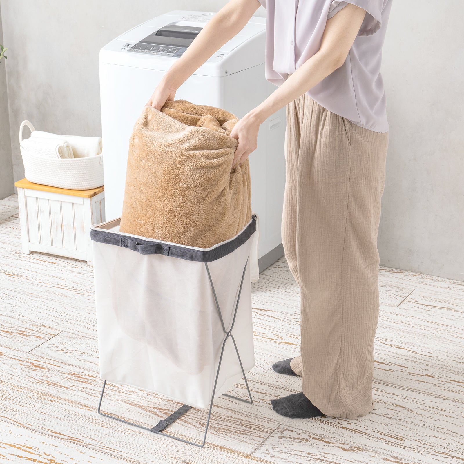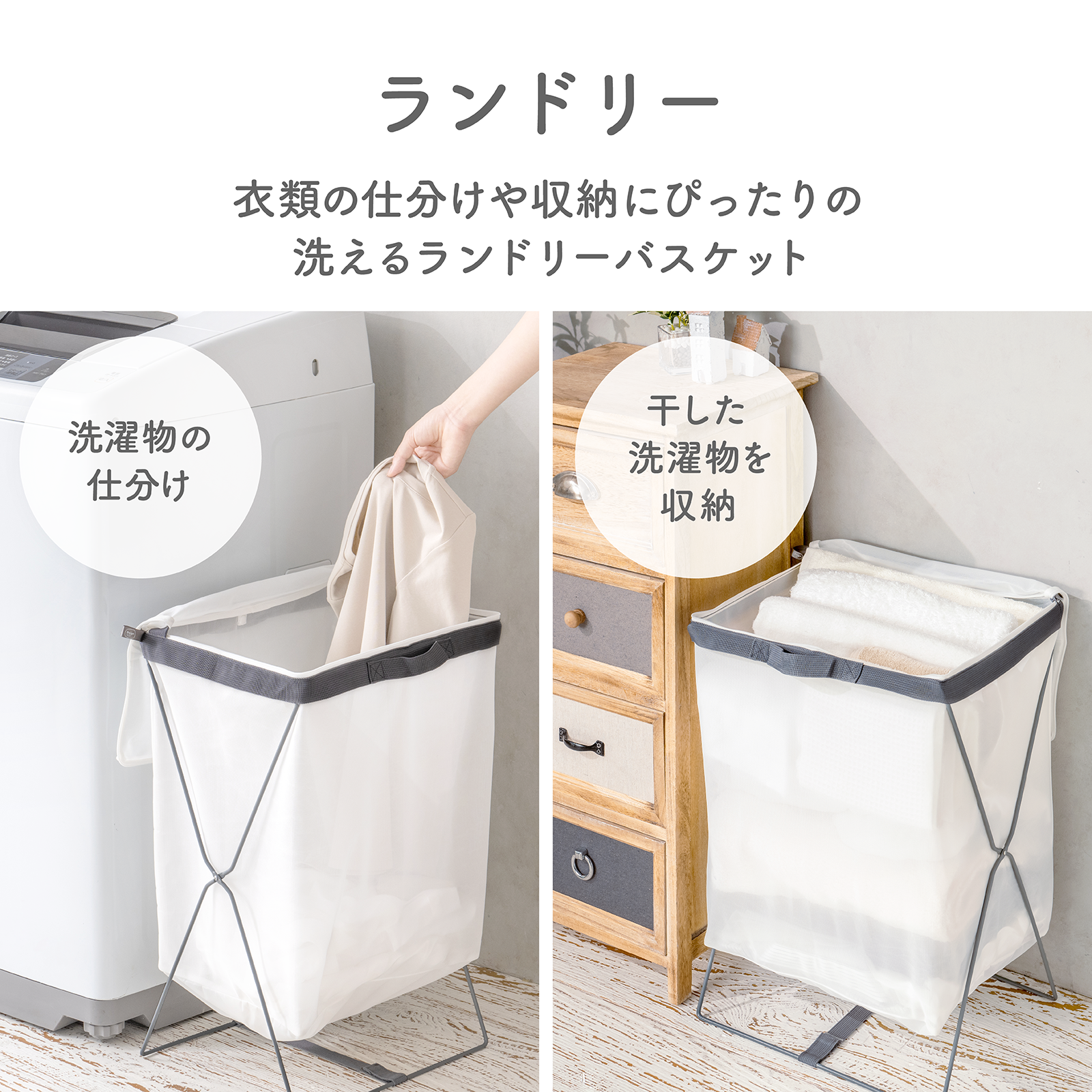 『フランドリー・洗えるランドリーバスケット』商品本体と使用シーン