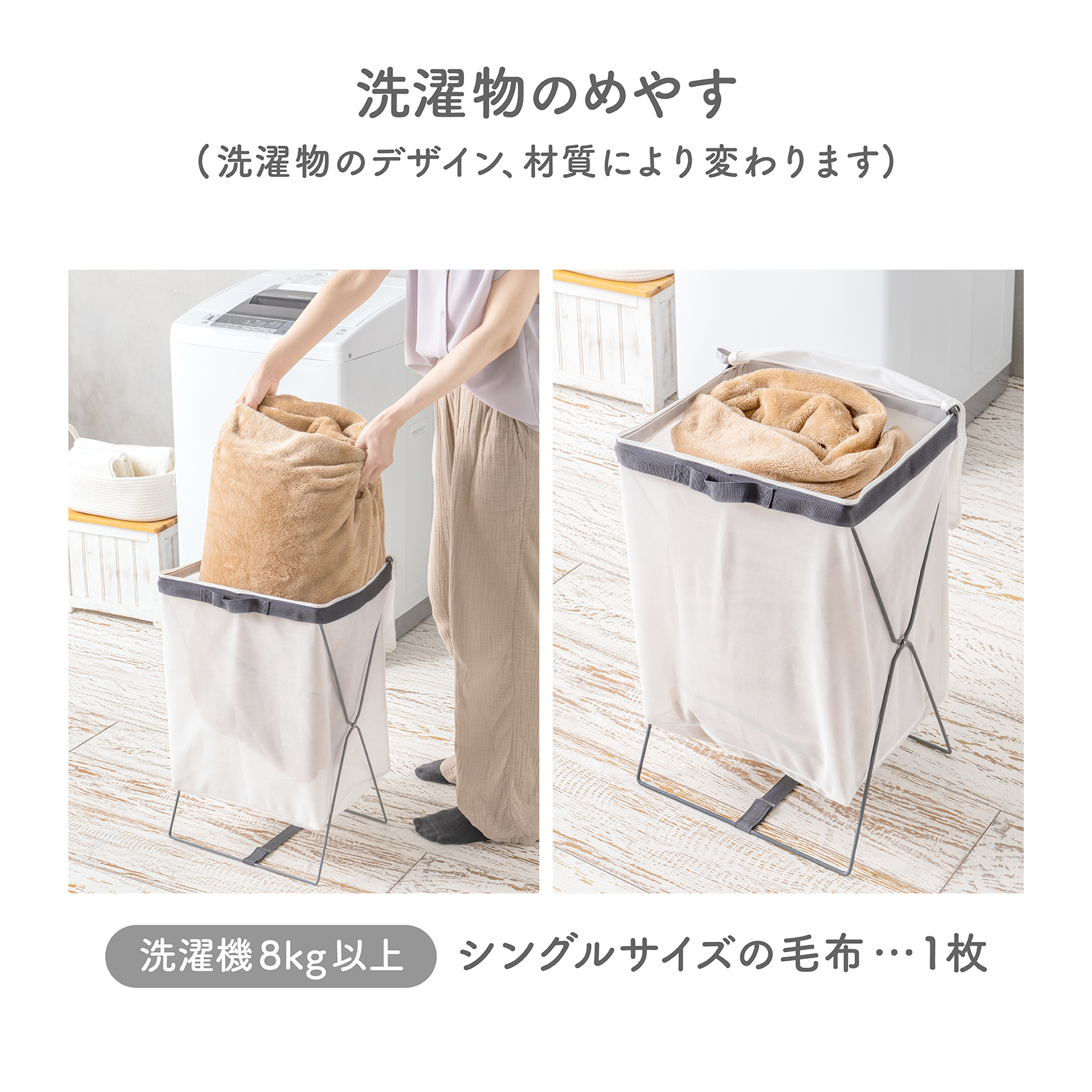 使用後の衣類やタオルなどを溜めておけば、ネットをスタンドから外してそのまま洗濯機で洗うことができます。タオルのまとめ洗いからシングルサイズの毛布まで、大容量で収納することができます。