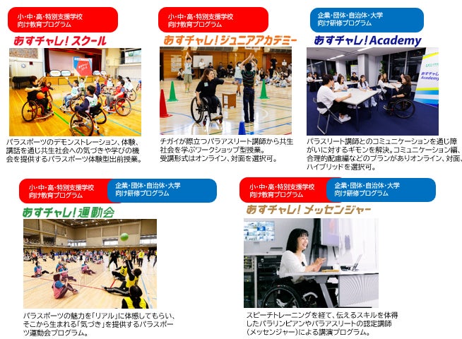 パラアスリートを中心とした講師が行う小・中・高・特別支援学校向けの教育プログラム、企業・団体・自治体・大学等向けの研修プログラム「あすチャレ!」は、全国で年間900回以上を開催、2016年度から2025年3月末までに国内外で約5,600回開催、子どもから大人まで58万人以上が参加しています。