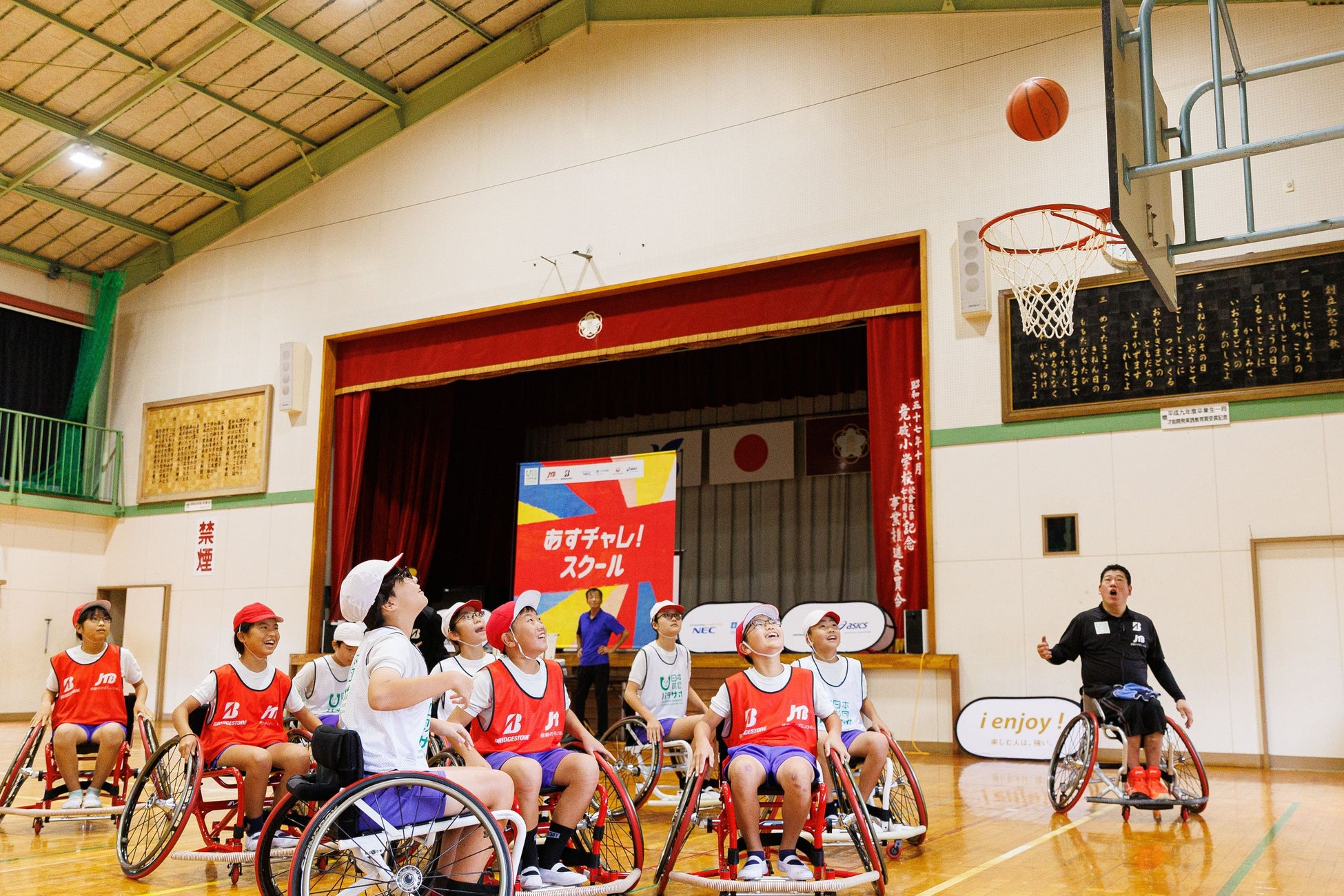 2016年、1台の大型車に12台の車いすバスケットボールの競技用車いすを積んで、講師1人、事務局員2人で「あすチャレ!スクール」がスタートしました。その後、仲間が少しずつ増え、2024年度にはパラアスリートを中心とした約80名の講師、職員、事務局スタッフ、および協賛社の皆さんと協力し、5つのプログラムを全国で965回実施いたしました。