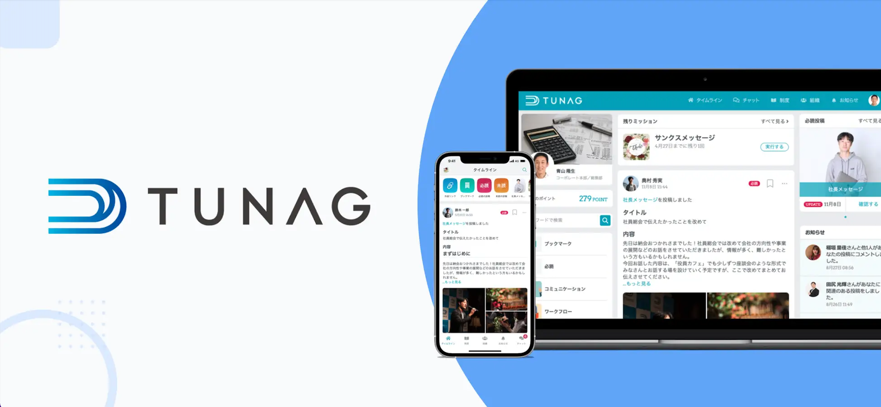 TUNAG(ツナグ)は、従業員の定着率向上や情報共有の促進、業務DXで、安定した組織運営を実現する社内アプリです。各社の組織課題の解決に最適な施策を設計・運用・改善できる高いカスタマイズ性と、弊社専任スタッフによる導入・活用支援により、強い組織づくりを支援します。また、社用PCや法人メールアドレスを持たないドライバー・現場社員でも利用しやすいよう、スマホアプリに最適化されています。規模や業種、業態を問わず700社以上の企業でご導入いただき、50万人を超えるユーザーにご活用いただいています。
