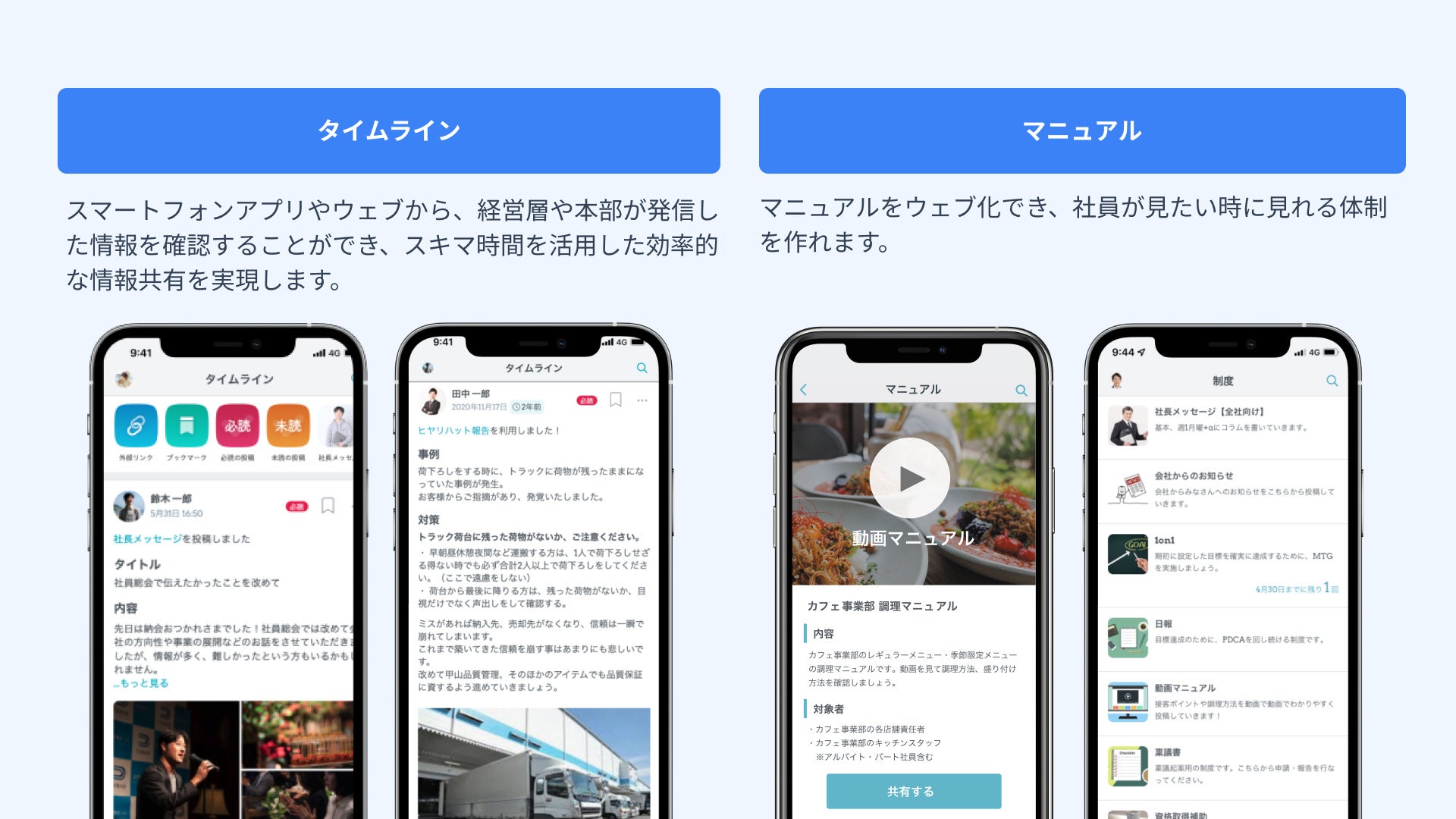 TUNAGはスマートフォンから利用でき、経営層や本部からの情報を、現場で働くドライバーにダイレクトかつ正確に共有します。一時的な発信のみならずマニュアルをはじめとしたナレッジ蓄積にも活用可能で、従業員はいつでも情報を見返すことができます。